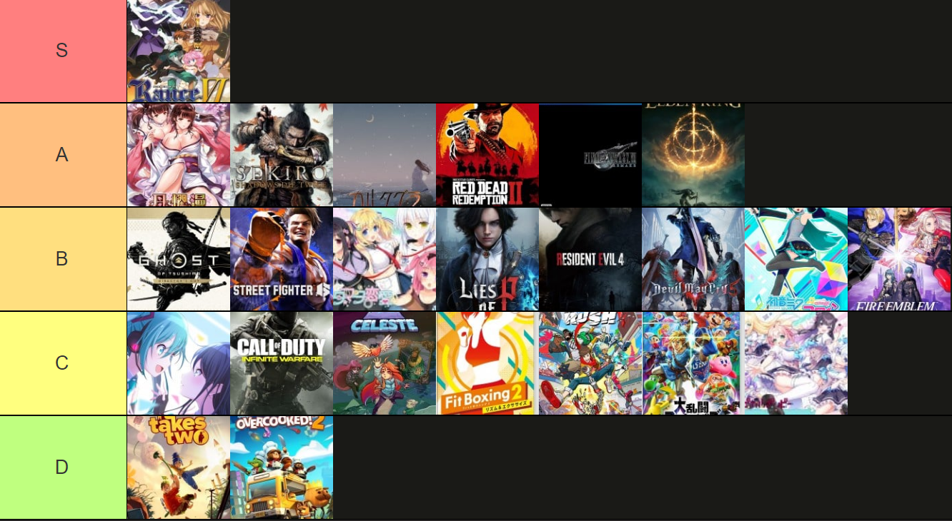 因为游戏不像动画一样需要追”新”游戏,就连今年大火的黑神话我也没有跟风去玩,我玩的每部游戏都是经过筛选的值得一玩的作品,这里的排行榜只是个人喜好上的感受。