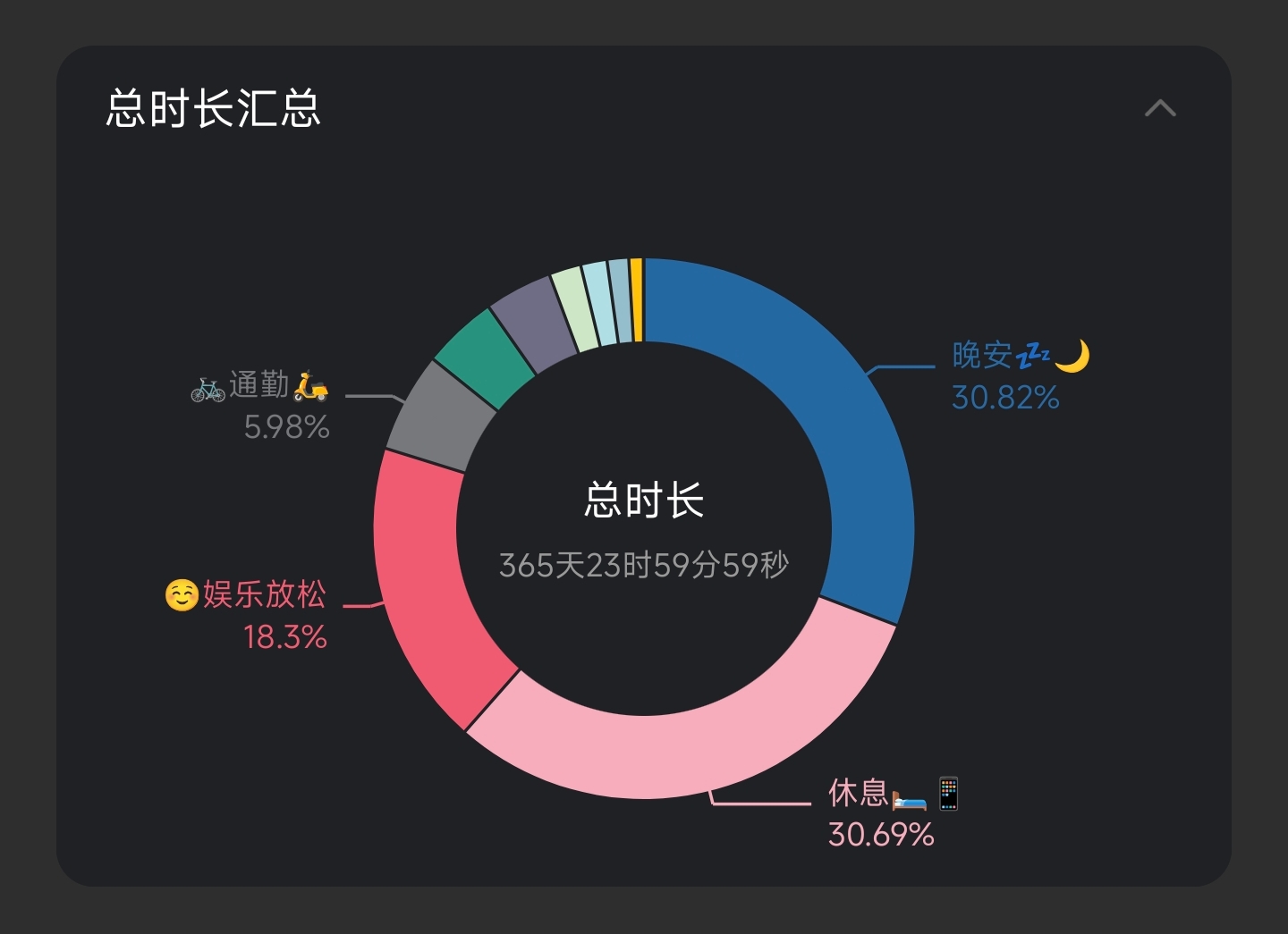 共分为睡眠,休息,娱乐,通勤,学习,上课,折腾,洗漱,上班,聊天,运动等11个部分,总耗时366天,以下按照24小时制按总时长排序: