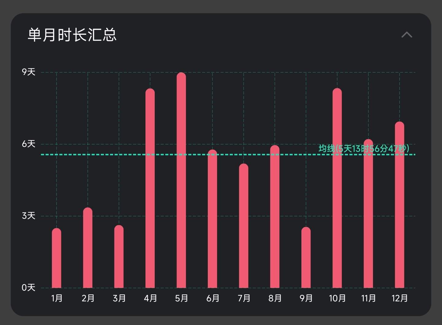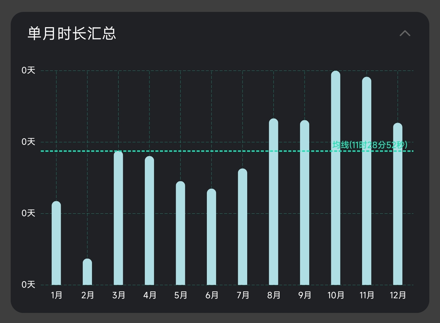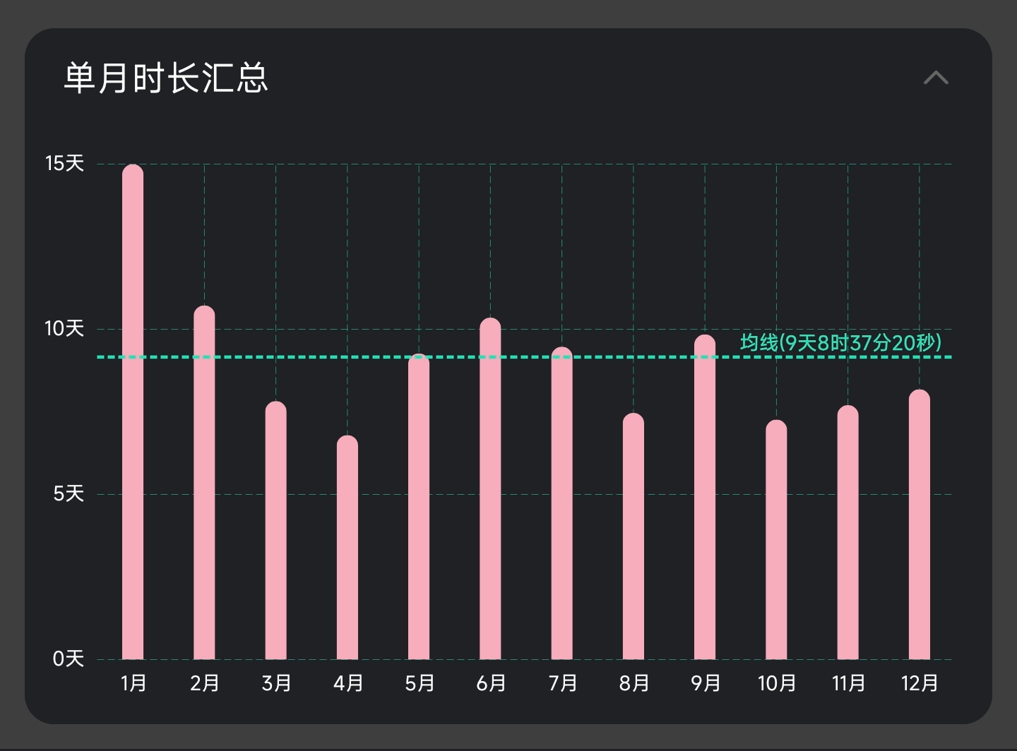 1月份耗时最多,足足耗时15天8时,推测是太冷了在被窝里刷手机,3,4月份和10,11月份有所回落,推测是寒暑假啥也没干产生的愧疚感。主要耗时在刷