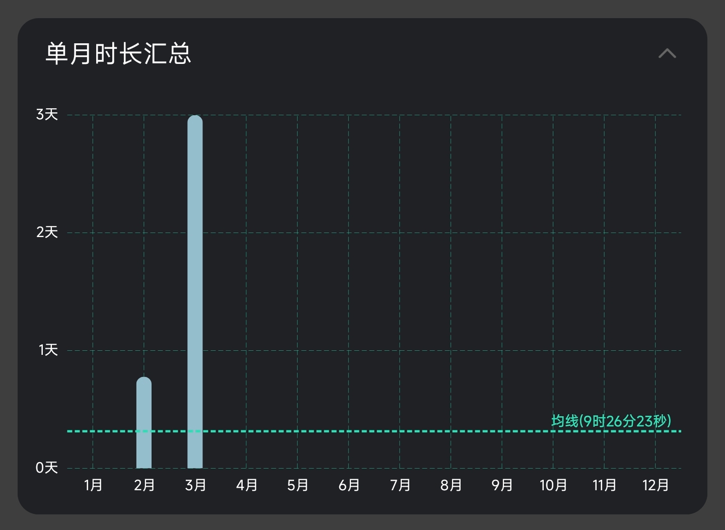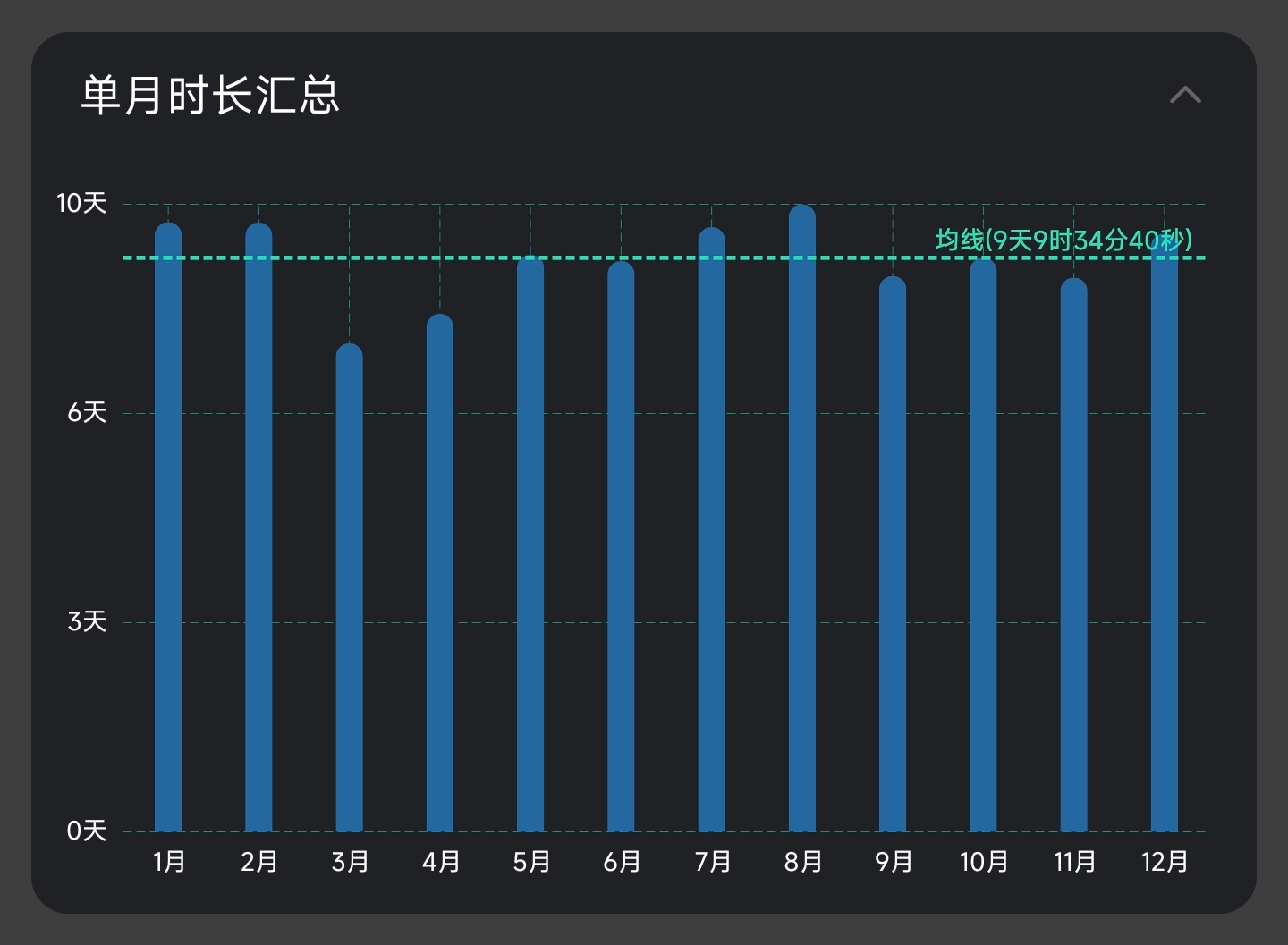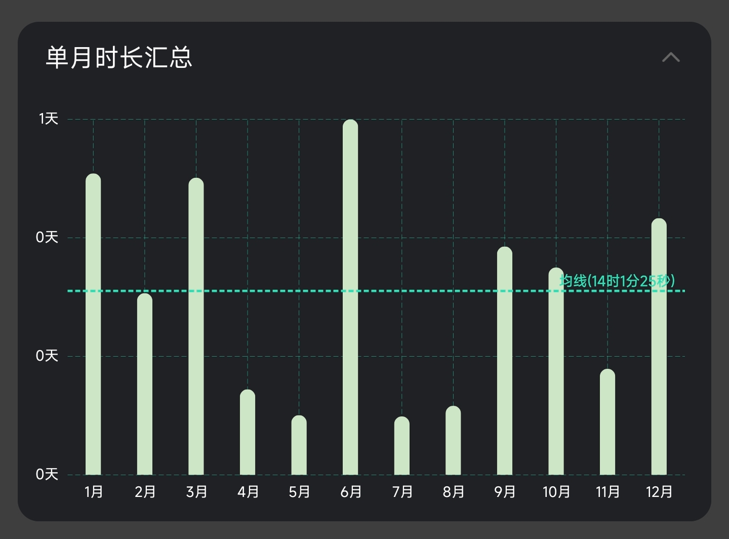 1月份耗时最多,足足耗时15天8时,推测是太冷了在被窝里刷手机,3,4月份和10,11月份有所回落,推测是寒暑假啥也没干产生的愧疚感。主要耗时在刷
