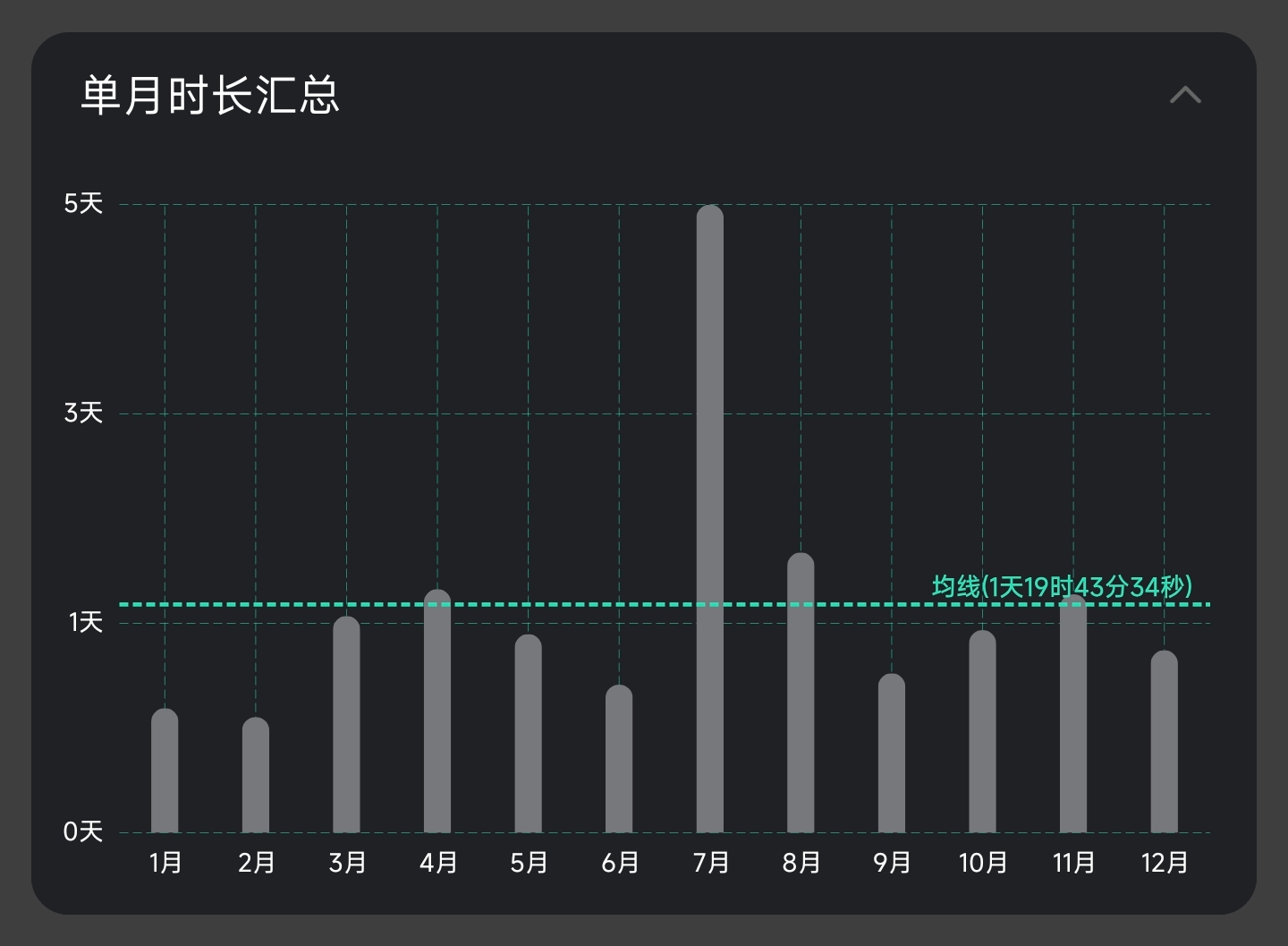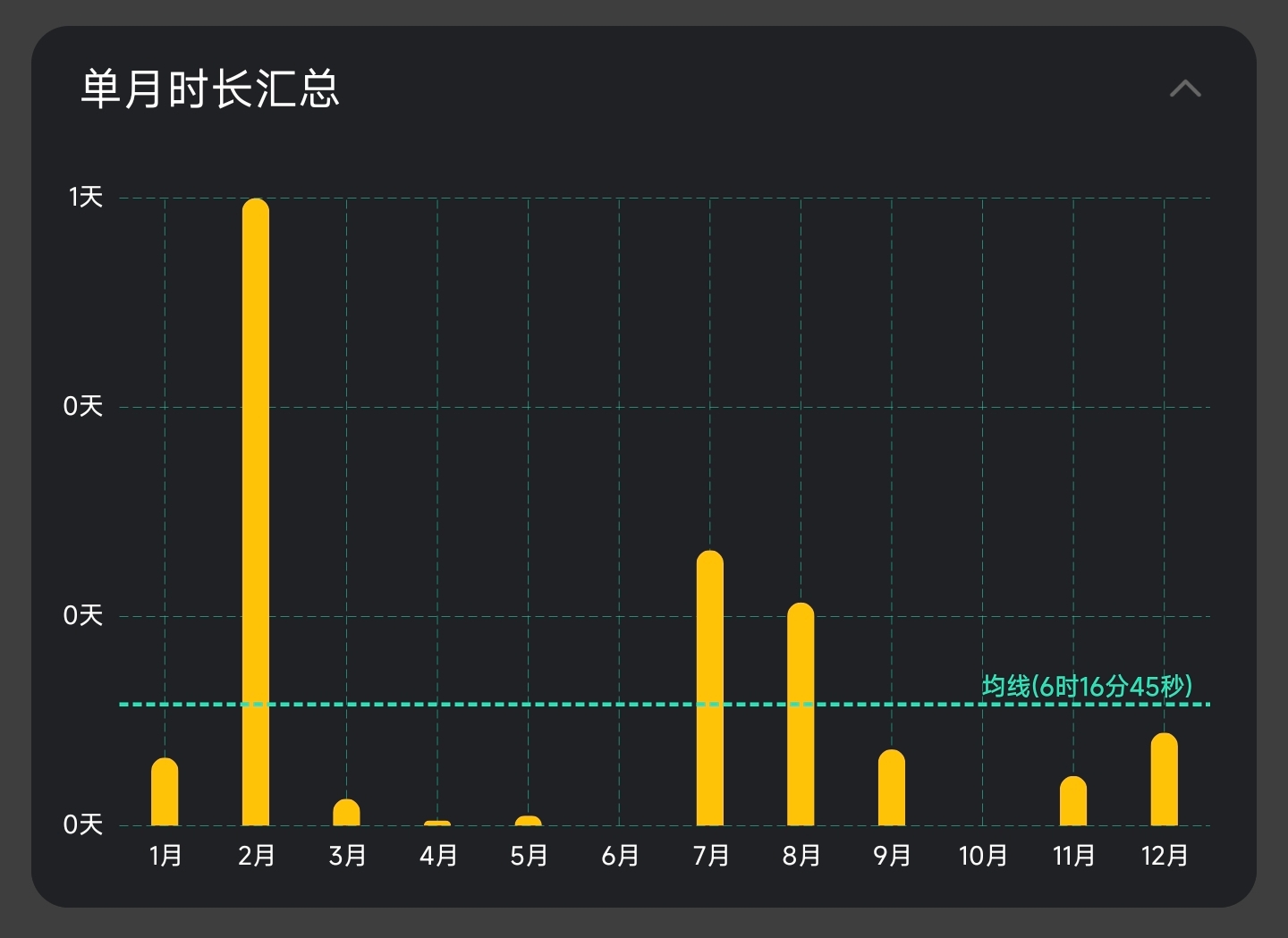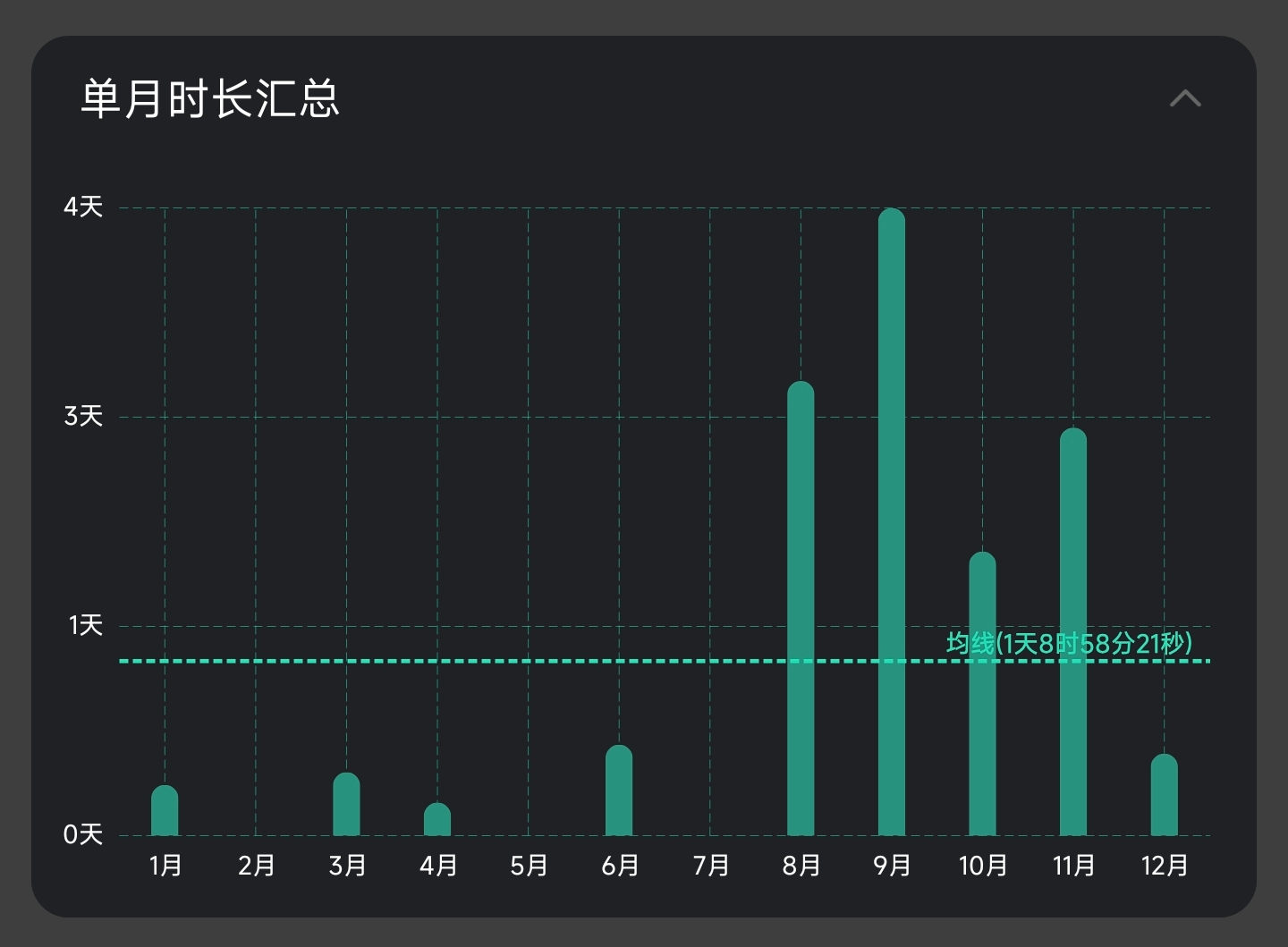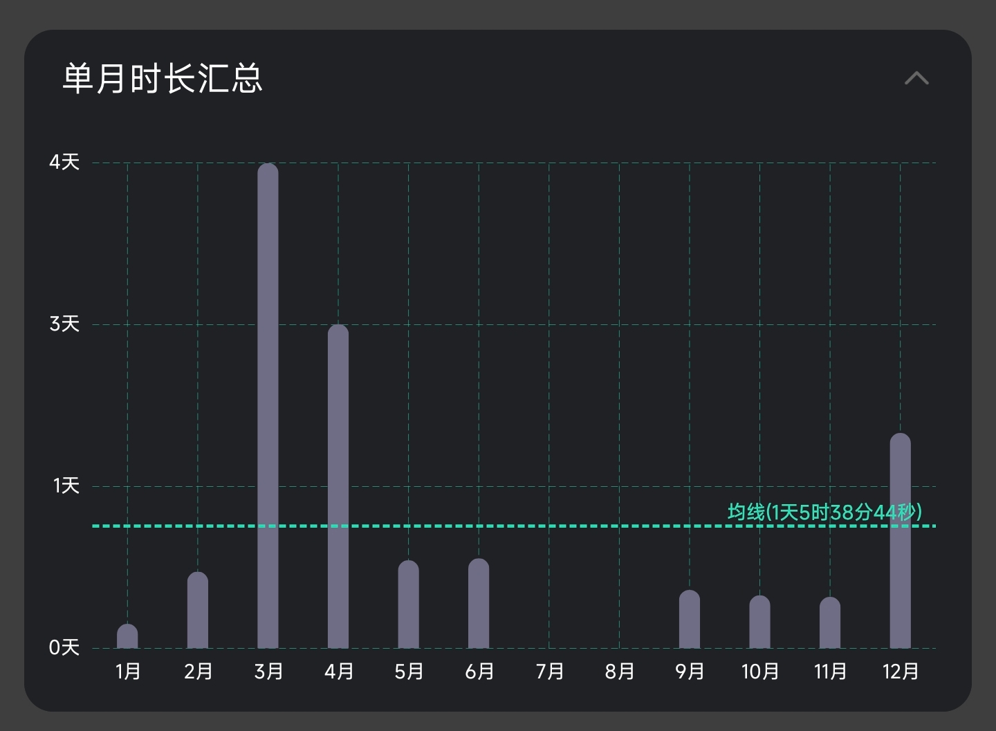 1月份准备期末考试+学英语,2月份过年回家,3月份打工,都偏少, 随后经历第一次龙场悟道就有了4,5月份暴涨,8月份暑假经历了第二次龙场悟道导致9月份暴跌, 随后反噬又有了10月份暴涨。总体前半年玩游戏居多,后半年看动画居多。除了看漫画外所有时间均在