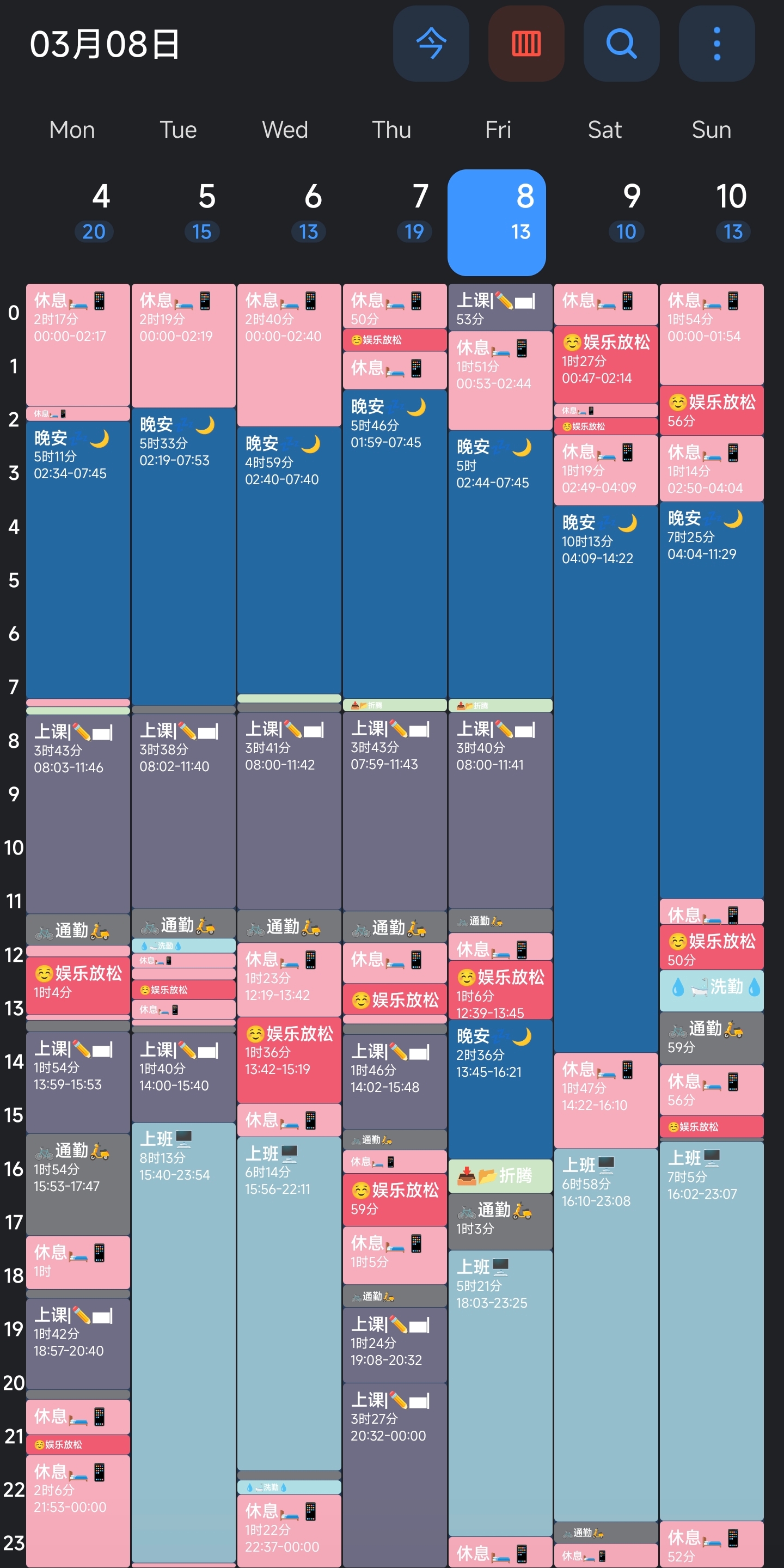 对未来的焦虑、父母的房贷、一无是处的自卑感、对浪费时间的愧疚、看别人建政引起的抑郁、虚伪的哥布林幻想、制定每周规划、手机设置专注模式、喜欢的ASMR主播开播了、今日动画片看完了…等。刷的最久的网课是韩顺平java, 最喜欢放的bgm是youtube的